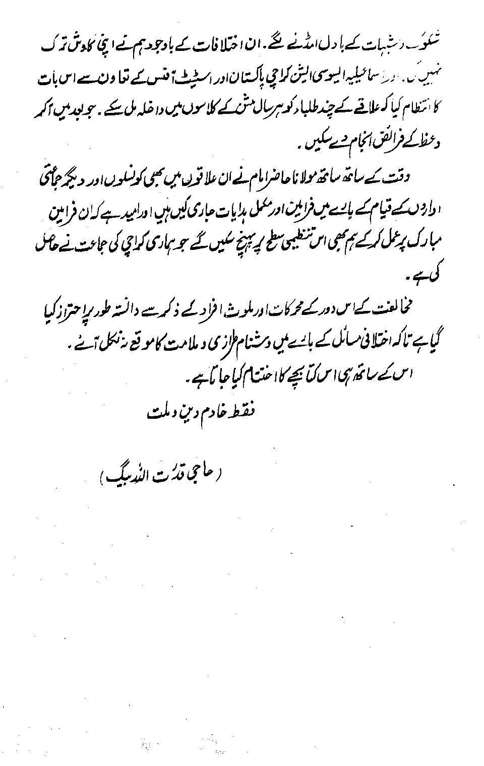 You will be happy to know that under my Firman His Highness the Mir of Hunza, with the assistance of Haji Qudrat-Ullah Beg submitted to me a draft constitution for my Jamats of Hunza State, Gilgit Agency, Chitral State and of Central Asia generally. This constitution has been drawn up in order to better the administration of our Jamati affairs and thus be of considerable benefit to all my spiritual children living in the afore-mentioned areas. Indeed the existence of such constitution for the Ismaili Jamat in Pakistan and many other countries has proved to be significant step in enabling the Jamat to run their affairs methodically and consistently and in keeping with our times. It would not be right if the Jamats of Hunza State, Gilgit Agency, Chitral State and Central Asia do not benefit from a similar means with which to improve the administration of their affairs.